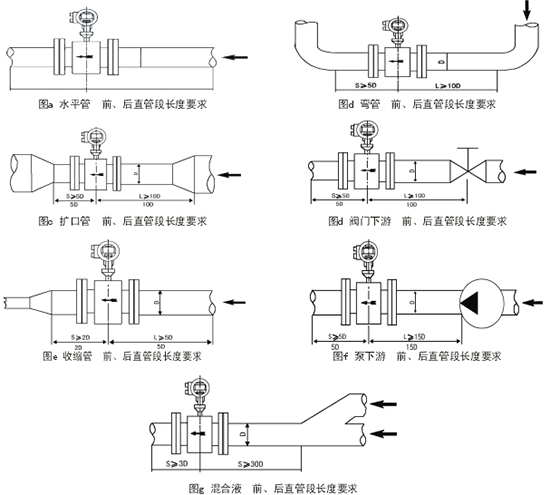上述2、3、4項情況,流量計上、下游須裝異徑管。異徑管中心錐角應不大于15°,且異徑管上游至少有5倍工藝管道直徑的直管段。