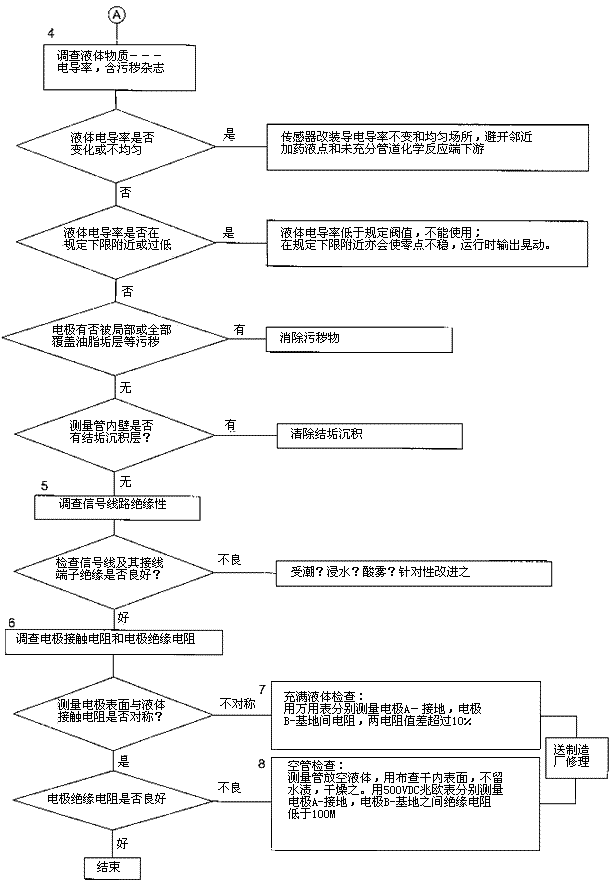 檢查流程圖*5項。信號回路絕緣下降會形成零點不穩(wěn)。信號回路絕緣下降的土要原因足,包極部位絕緣下降所引起的,但也不能排除信號電纜及其接線端子絕緣下降或破壞。因為有時候現(xiàn)場環(huán)境十分嚴(yán)酷,稍一疏忽儀表蓋、導(dǎo)線連接處密封不慎,彌漫著潮氣酸霧或粉粒塵埃侵入儀表接線盒或電纜保護(hù)層,使絕緣卜降。信號回路絕緣電阻檢查分別按電纜側(cè)和流量傳感器側(cè)兩郵分進(jìn)行,用兆歐表測試。因信號電纜容易可先做。流量傳感器再分兩次進(jìn)行:充滿液體測黽電極表面接觸電阻和個管后測量,U極絕緣電阻。