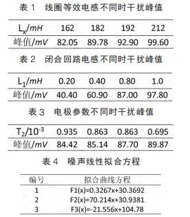 仿真試驗(yàn)中,設(shè)定線圈等效電感取值范圍為 162~212mH,間隔 10mH;閉合回路等效電感范圍 0.2~1mH,間隔為 0.2mH;雙電層電容、接觸電阻隨流體電導(dǎo)率變化而變化,電導(dǎo)率增大接觸電阻和雙電層電容減小而電荷傳遞電阻增大。可設(shè)定電極接觸電阻、雙電層電容和電荷傳遞電阻范圍分別為 5~15kΩ、10~20μF 和50~60Ω,由公式(7)知,可用 T2 表示上述三者關(guān)系。 仿真參數(shù)取值不同情況下,通過 MATLAB 工具箱對(duì)仿真測量得到的干擾峰值進(jìn)行曲線擬合畫出相應(yīng)的曲線圖。 其中仿真數(shù)據(jù)和相對(duì)應(yīng)的曲線方程如表 1~表 4 所示,曲線圖如圖 4~圖 6。