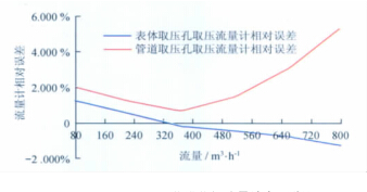 從以上數(shù)據(jù)表和曲線圖中可以看出:空氣流量計型號一定的情況下,用表體取壓孔取壓方式檢定流量計時流量計的線性度較好,用管道取壓孔取壓方式檢定流量計時流量計的線性度較差;流量測點相同的情況下,表體取壓孔取壓檢定方式的流量計誤差較小,管道取壓孔取壓檢定方式的流量計誤差較大;兩種取壓方式引起的誤差隨著流量的增大而逐漸增大,在流量為2 900m3/h時兩者相差近6.2%,遠遠超出了流量計的準確度等級。所以,在空氣流量計的檢定過程中,應避免在流量計表體取壓孔以外的地方取壓進行檢定。