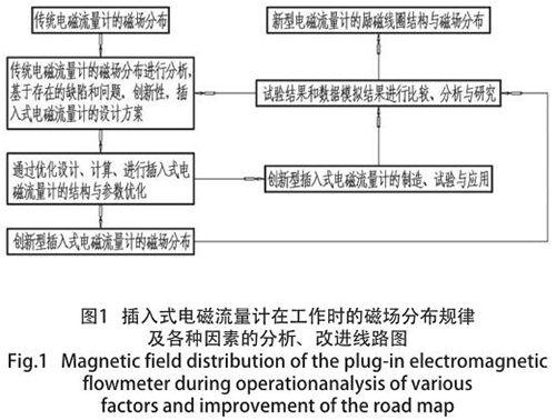 電磁流量計(jì)因其特殊的結(jié)構(gòu)形式,致使其抗干擾能力較弱、準(zhǔn)確度偏低以及瞬時(shí)流量波動過大等不良現(xiàn)象,但便于安裝、造價(jià)低廉、普遍應(yīng)用于大管道等特點(diǎn)而存在。為了發(fā)揮其優(yōu)勢,消除其不利因素,對其內(nèi)部結(jié)構(gòu)及其相關(guān)技術(shù)參數(shù)進(jìn)行優(yōu)化設(shè)計(jì),從而使其準(zhǔn)確度能夠達(dá)到 ±1% FS,使抗干擾能力得到極大地增強(qiáng)。本文主要通過優(yōu)化設(shè)計(jì)、選擇材料和試驗(yàn),使電磁流量計(jì)的穩(wěn)定性和準(zhǔn)確度大幅度提高,并提出解決措施,對實(shí)際應(yīng)用具有參考價(jià)值。分析與研究程序圖如圖 1 所示。