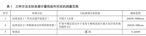 本規(guī)范包含三種校準方法,分別為標準表法 1(外夾式超聲流量計)、標準表法 2(串聯(lián)移動式在線校準裝置)和稱重法,編制組對每種方法進行了大量的實驗,并積極與管道式流量計生產(chǎn)廠家及用戶溝通探討,積累了豐富的經(jīng)驗,獲得了大量的實驗數(shù)據(jù),*終確定三種方法的主標準器計量性能和對應(yīng)的測量范圍,如表 1 所示。