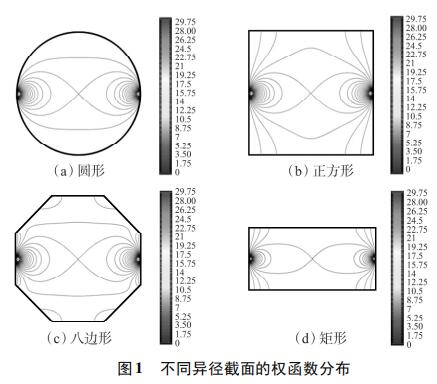 為考察不同異徑截面權函數分布的均勻性,使用上述方法對圓形、正方形、八邊形和矩形異徑截面的權函數分布進行定性分析。為了便于對比,設置管道口徑為DN100,異徑部分截面積為3200mm2。所以,圓形異徑面半徑為32mm,正方形異徑面邊長為56.6mm,八邊形異徑面邊長為25.8mm,矩形異徑面長寬為80×40mm。仿真結果如圖1所示,為了便于對比,權函數等勢線大小從0開始,以0.25為步長遞增到30。由圖1(a)~圖1(d)可知,矩形異徑截面的權函數等勢線間距*大,即權函數變化梯度*小,權函數分布*均勻。