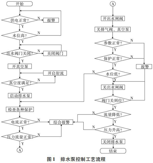 排水泵進(jìn)行自動(dòng)化控制模式后,當(dāng)水倉(cāng)水位達(dá)到開(kāi)泵要求,PLC 自動(dòng)檢測(cè)電動(dòng)閥門(mén)、球閥、供電電壓等是否正常后,啟動(dòng)真空泵進(jìn)行抽真空,當(dāng)水泵真空度符合開(kāi)泵要求時(shí)便啟動(dòng)排水泵。排水泵正常運(yùn)轉(zhuǎn)后 PLC 時(shí)時(shí)收集運(yùn)行數(shù)據(jù)進(jìn)行比對(duì),當(dāng)發(fā)現(xiàn)運(yùn)行數(shù)據(jù)比對(duì)出現(xiàn)差異時(shí)影響到排水泵正常運(yùn)轉(zhuǎn)時(shí),會(huì)發(fā)出停泵命令。排水泵控制工藝流程如圖 1 所示。
