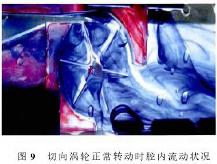 圖9記錄的是切向渦輪正常轉動時的流場,圖9中水從左向右流動,實驗時水速較快(1m3/d),渦輪葉片順時針轉動。水速變大后,擾動變大,不再是無旋繞角流動,腔體1中流體形成一個運動的旋渦,導致腔內壓強分布不再對稱,產生壓差,致使渦輪葉片轉動,旋渦在隨葉片運動到腔體2中時逐漸耗散消失。數值仿真的計算結果與物理實驗的結果基本一致。