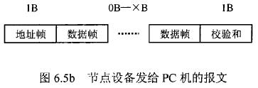 在插入式電磁流量計等節(jié)點設(shè)備和C機通信的過程中,由地址幀、命令幀、數(shù)據(jù)幀、校驗和可組成各種功能不同的報文。由于采用主從工作方式來實現(xiàn)通信,插入式電磁流量計等節(jié)點設(shè)備僅能接收并執(zhí)行PC機發(fā)送來的控制命令,而不能發(fā)送命令給PC機。因此,由PC機發(fā)往流量計等節(jié)點設(shè)備的報文一般包括一個地址幀,一個命令幀,若干個數(shù)據(jù)幀和一個校驗和,其報文格式圖.6a5所示;而由流量計等節(jié)點設(shè)備發(fā)往PC機的報文一般包括一個地址幀,若干個數(shù)據(jù)幀和一個校驗和,其報文格式如圖6.5b所示。