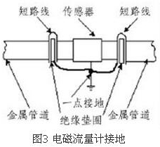 (4)盡量避開振動(dòng)源、磁源(大功率電機(jī)、變壓器)由于dn200電磁流量計(jì)的測量感應(yīng)電壓很小,電壓較低,易受外界電磁噪聲的影響,故在安裝時(shí)應(yīng)進(jìn)行可靠的接地連(跨)接。金屬管道dn200電磁流量計(jì)接地連(跨)接方法如圖3所示