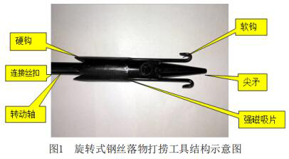 在大慶油田*三采油廠北3-6-P71井測試時,當儀器下至井下800m時,由于鋼絲有砂眼,800m鋼絲連同流量計一起掉井,該井球座深度為1200m。為此進行了落物打撈。*先使用兩片通井工具將井內鋼絲壓成一團。再使用旋轉式打撈矛下入井內,抓住落物完成打撈。使用旋轉式打撈矛打撈鋼絲落物時打撈矛應有一定的質量,要平穩操作、慢起慢下。