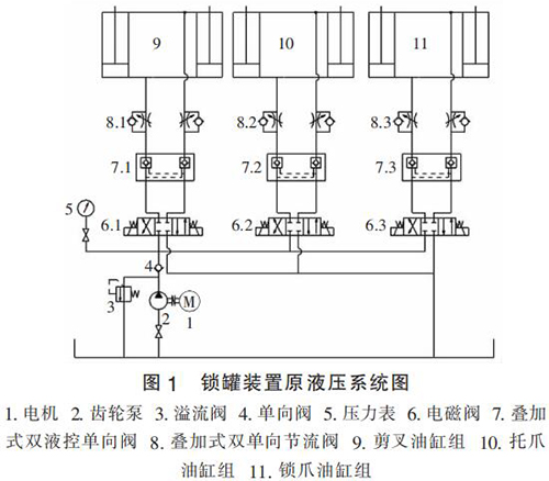 防爆型渦街流量計原液壓系統(tǒng)圖如圖 1 所示。 通過分析圖 1 發(fā)現(xiàn),原液壓系統(tǒng)中剪叉油缸組、托爪油缸組及鎖爪油缸組并聯(lián)安裝,并均由齒輪泵供油,該系統(tǒng)設(shè)計簡單,液壓元件選擇不夠合理,工作效率低,電機發(fā)熱大,主要存在的問題: