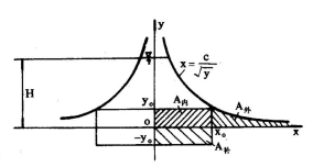 即縱坐標(biāo)y值趨近于零時(shí),橫坐標(biāo)x值趨近無窮大。這在堰板的實(shí)際制作上是無法實(shí)現(xiàn)的。若將堰口曲線的*低縱坐標(biāo)取為yo,在yo一下至(-yo)增開一矩形,即高為2yo,寬為2x。的補(bǔ)償孔,從數(shù)學(xué)上可以證明,坐標(biāo)原點(diǎn)以下所增大的矩形面積(A補(bǔ))正好等于舍去的曲邊面積(A補(bǔ))。由圖3可知