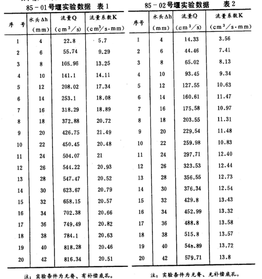 1.具有補(bǔ)償?shù)卓椎碾p曲線無脊薄壁堰(見圖7),在作用水頭超過補(bǔ)償孔以上時(shí),通過流量與作用水頭之間具有較好的線性變化關(guān)系,其流量系數(shù)K值基本保持在20.5cm³/s·mm左右。