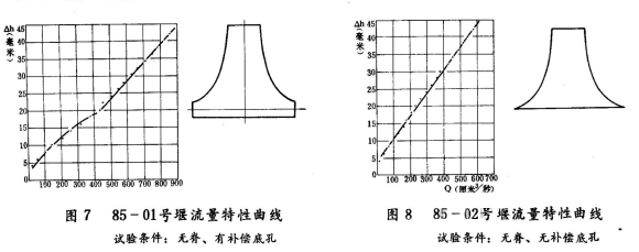 用85-01號(hào)和85-02號(hào)兩種雙曲線薄壁堰,在試驗(yàn)水槽端安裝成無脊有補(bǔ)償孔和無補(bǔ)償孔兩種情況,進(jìn)行了多次實(shí)驗(yàn),所得數(shù)據(jù)通過整理,畫出流量特性曲線,見圖7和圖8。